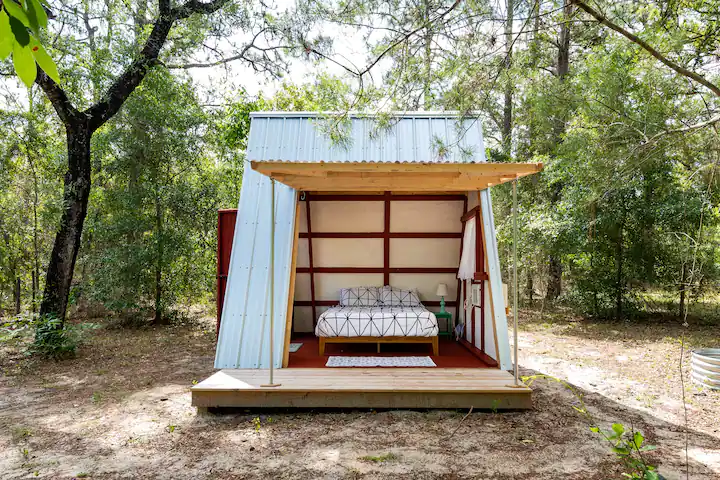 Glamping Tuscan Style in and Aframe Cabin Tent, nestled in a beautiful, producing, olive orchard. AC, Queen Bed, TV, Wi-Fi and an amazing view. Close to Weeki Wachee River State Park, mermaids and manatees, Chasahawitzka River, hiking Trails, fishing pier, Pine Island Beach. On the SC Bike Path. 2 kayaks to take to rivers.
