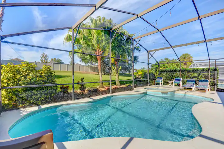 Leave the hustle and hassle of city life to the tranquil sounds of wind over palm trees while relaxing in the spa or pool with cold beverage. While others freeze in the north, enjoy the warmth of being poolside in this stylish central Florida home. Here relaxation is not an option; we require it. This home has 4 bedrooms (King master, queen guest, twin guest, bunk guest) and 2 baths (ensuite master and guest). About 10 minutes to the Disney private road and 5 minutes to shops much dining.