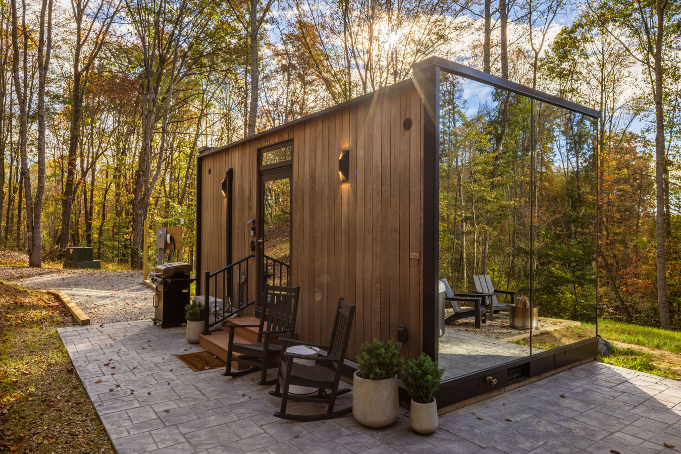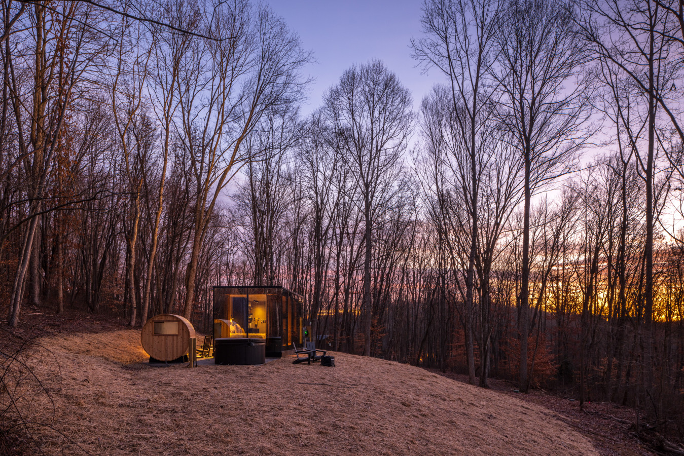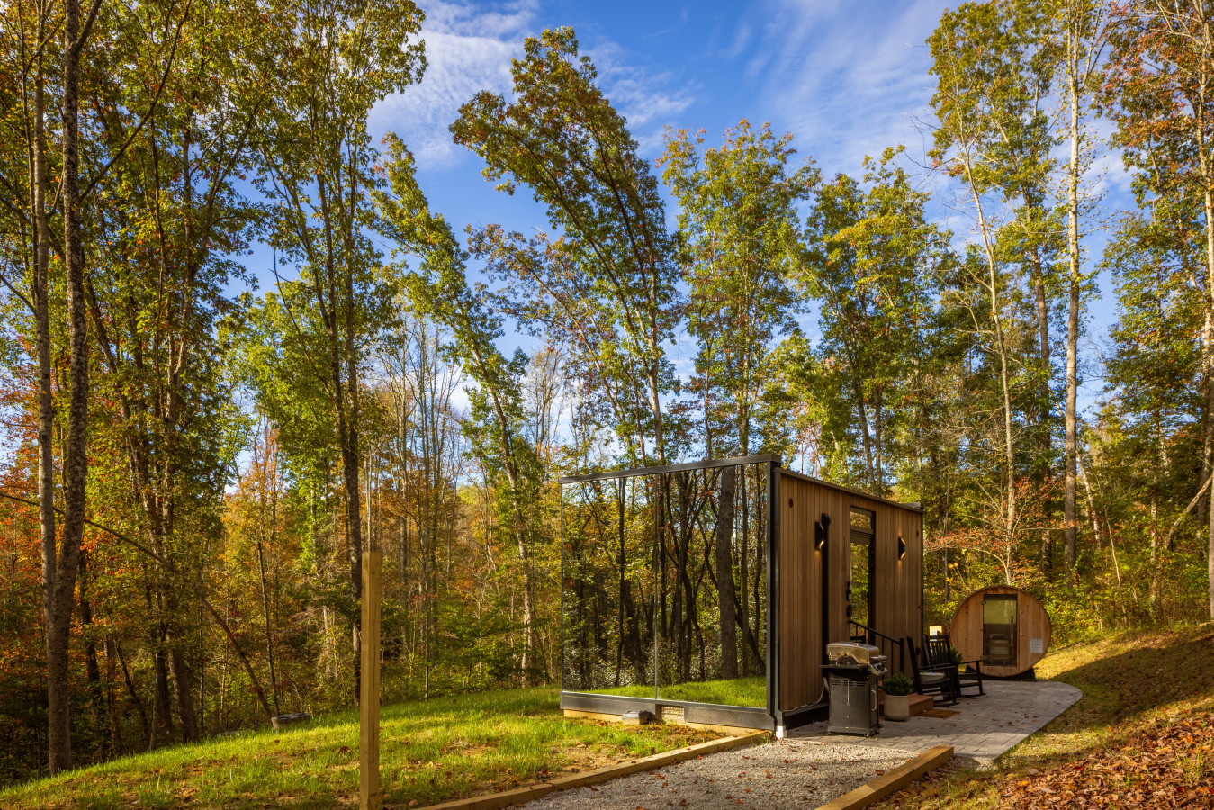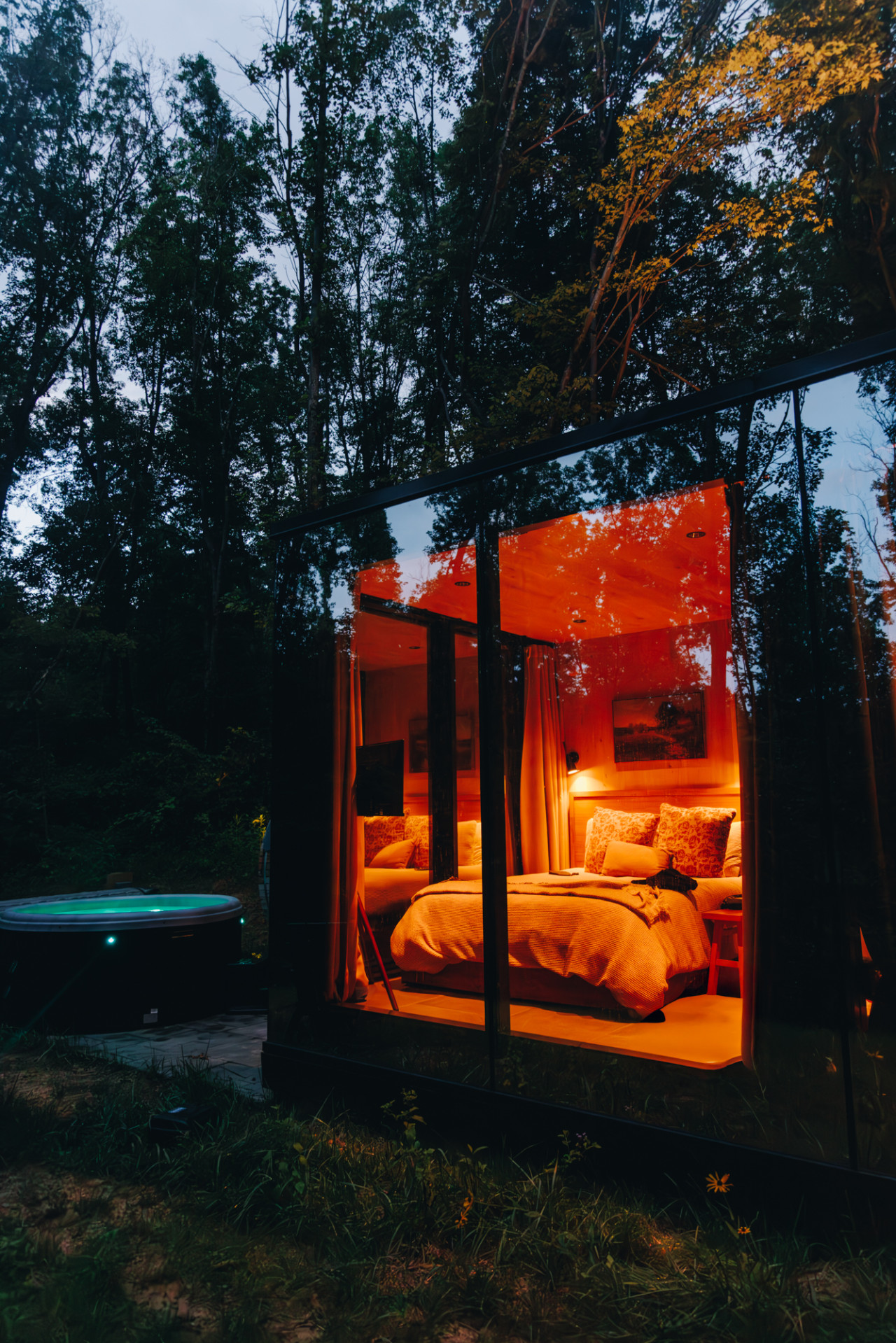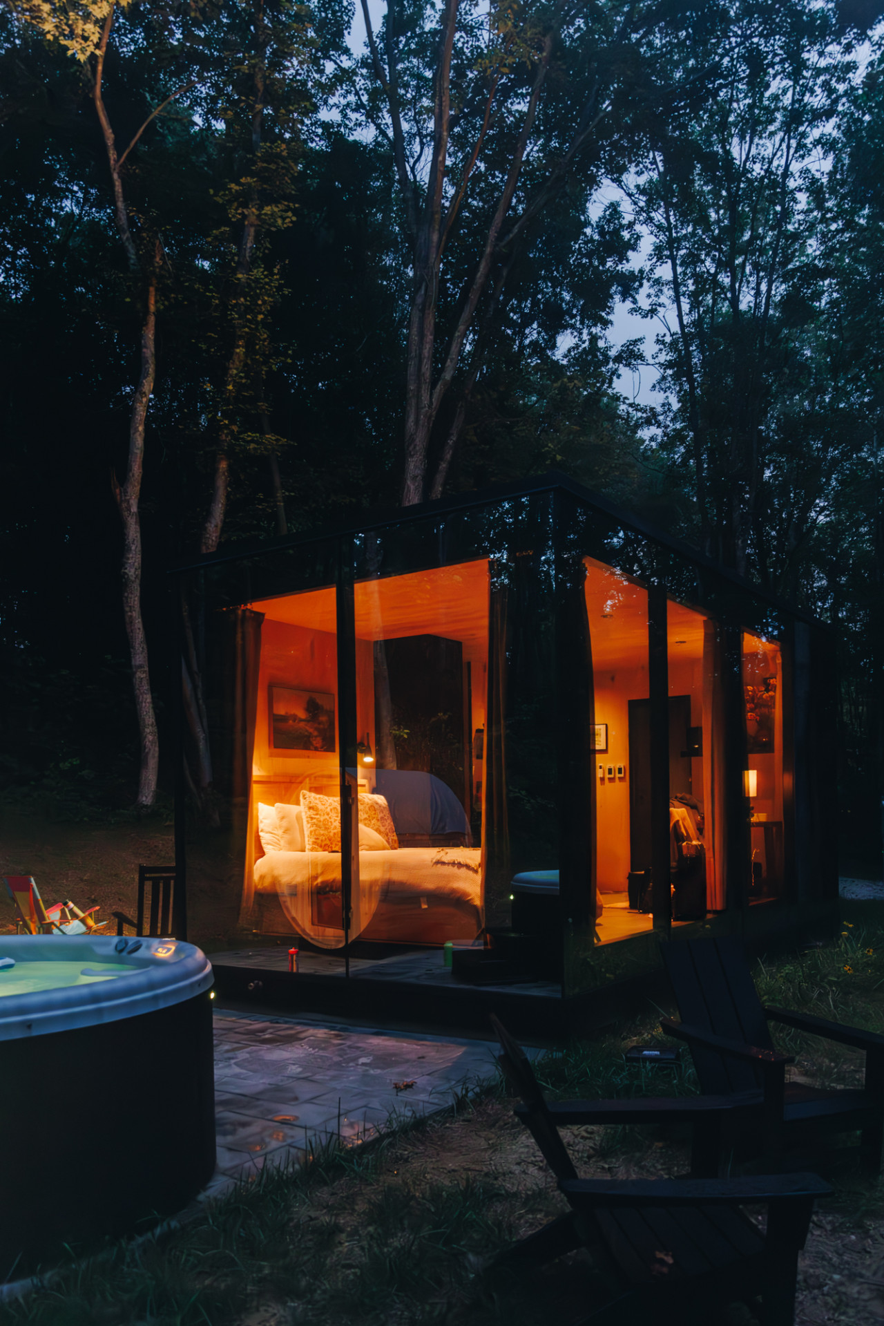 / night✨ This luxurious glass cabin retreat offers all the comforts of home—complete with a well-appointed kitchenette, a cozy fire pit, and a plush queen-sized bed—all surrounded by the quiet beauty of the woods. With soft, filtered views of the night sky and easy access to scenic hiking trails, The Illusion Hideaway is the perfect place to step away from the everyday and rekindle both romance and adventure. Book your stay at The Illusion Hideaway and experience the ultimate blend of relaxation, rejuvenation, and natural beauty. ✨