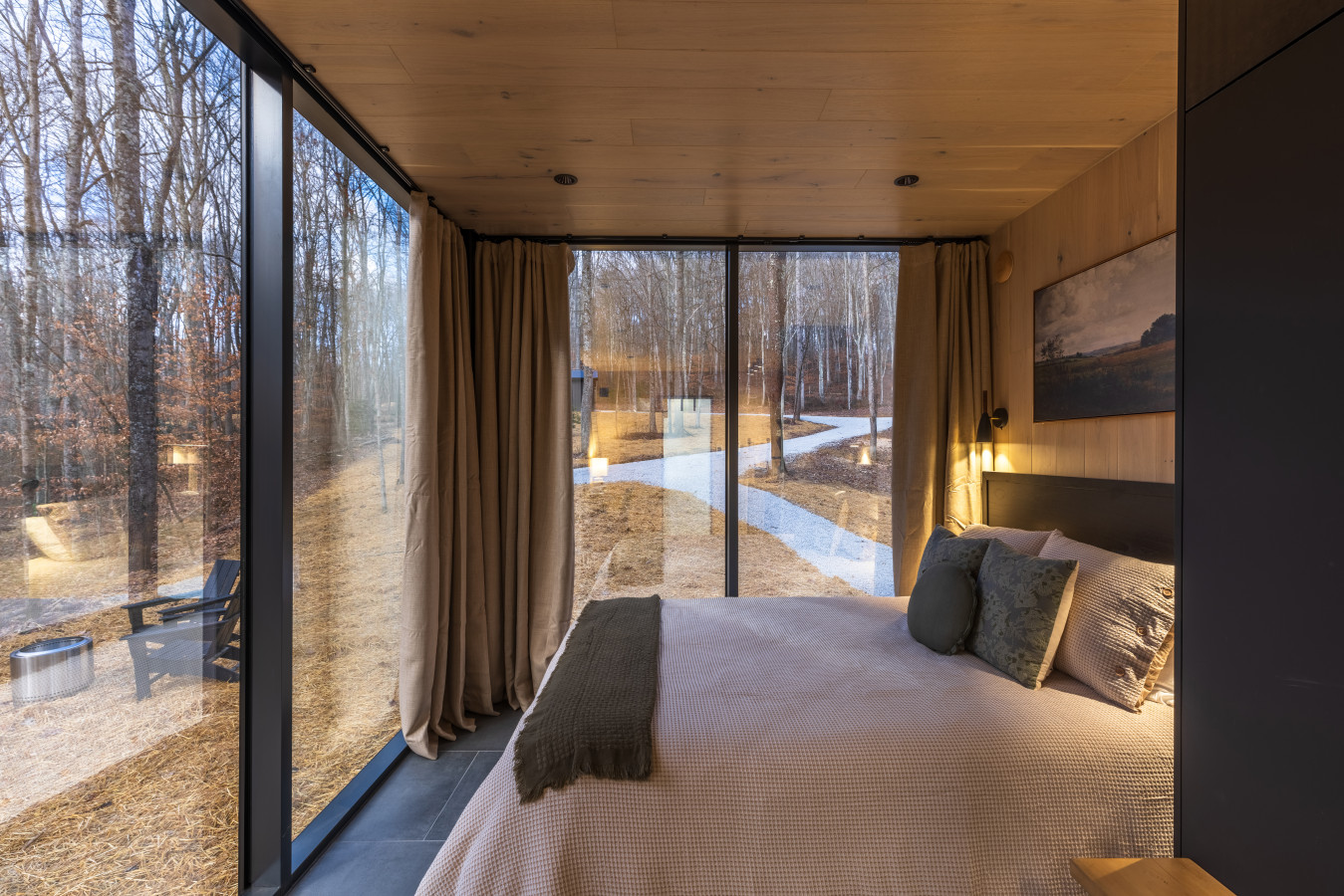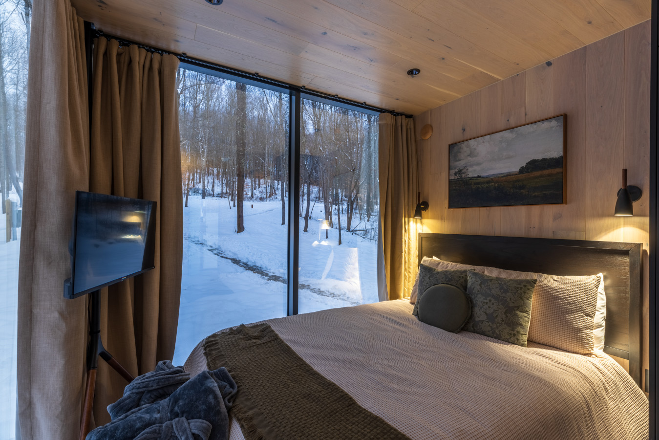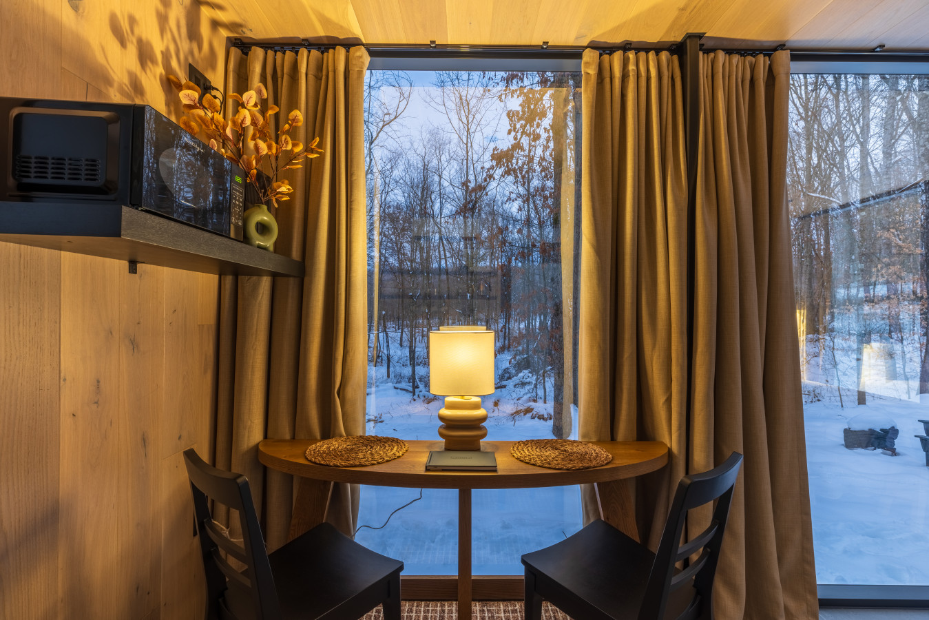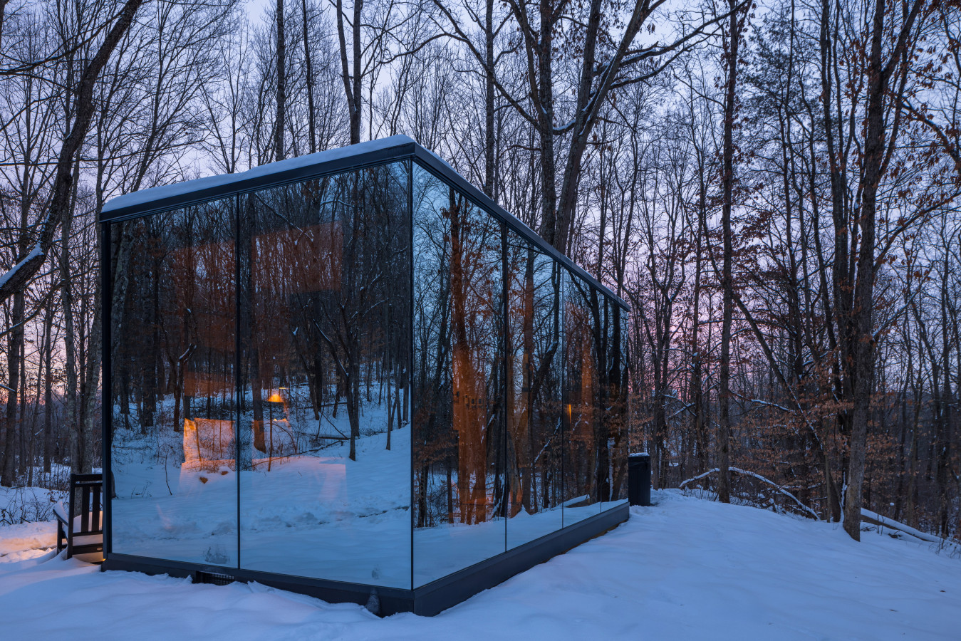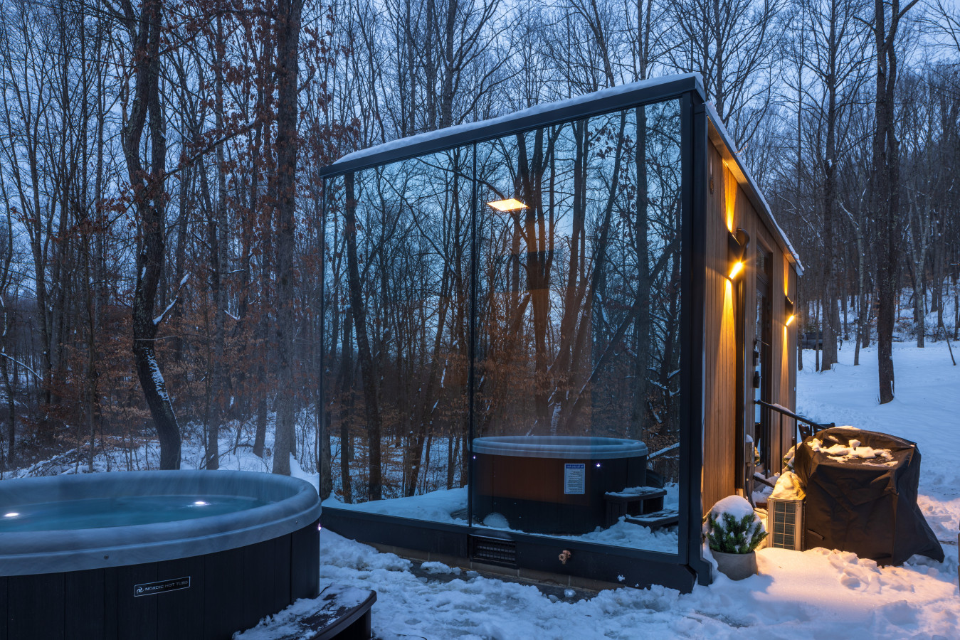 / night✨ This luxurious glass cabin retreat offers all the comforts of home—complete with a well-appointed kitchenette, a cozy fire pit, and a plush queen-sized bed—all surrounded by the quiet beauty of the woods. With soft, filtered views of the night sky and easy access to scenic hiking trails, The Mirage is the perfect place to step away from the everyday and rekindle both romance and adventure. Book your stay at The Mirage and experience the ultimate blend of relaxation, rejuvenation, and natural beauty. ✨