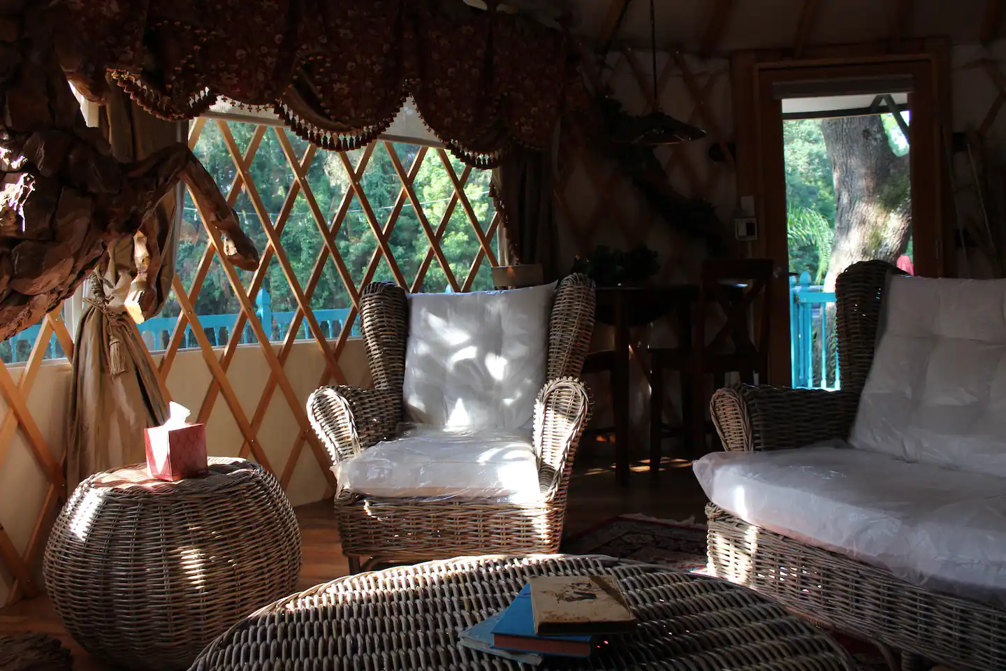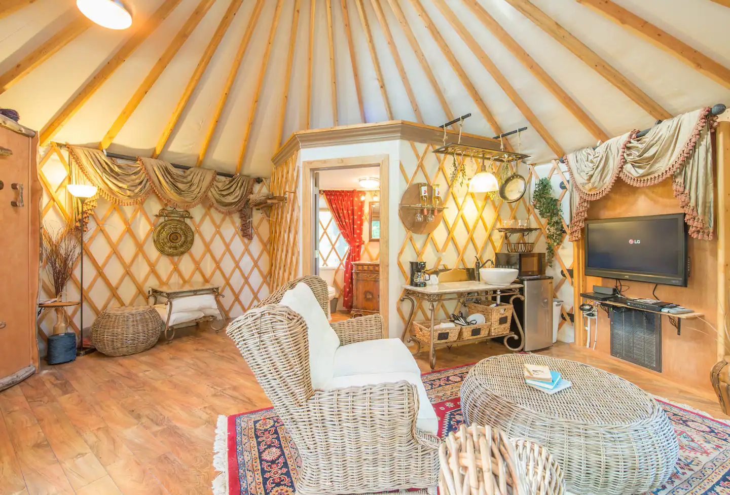 You will be staying in a 21-foot diameter yurt built by Rainier Yurts. It is fully air-conditioned and has a 14-foot vaulted ceiling with a 5-foot skylight. It contains a full bath, a mini kitchen with microwave and small frig, and king size bed with a Select Comfort mattress. There is also a flat screen television, DirecTV satellite and Wi-Fi that are all included. Outside the yurt is a large porch with fire pit/barbecue grill and unique swing.